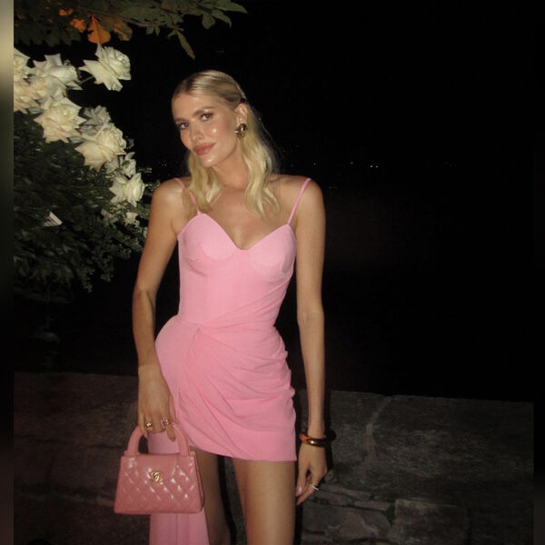 Модель Лена Перминова позировала в розовом мини-платье с сумкой Chanel Kelly. Стоимость изделия на официальном сайте составляет $7950 (720 тысяч рублей). Образ завершили открытые черные босоножки. Ей также сделали укладку с локонами и легкий вечерний макияж.