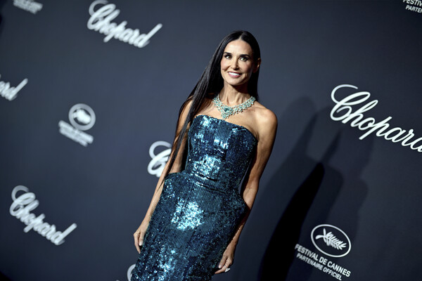 61-летняя Деми Мур стала гостьей церемонии вручения премии Chopard Trophée Awards, которая состоялась 17 мая в Каннах. Для светского мероприятия голливудская актриса выбрала облегающее платье-бюстье Balenciaga синего цвета, украшенное пайетками. Образ знаменитости дополнили бриллиантовые украшения Chopard: колье и кольцо. Визажисты сделали Деми Мур вечерний макияж с черными стрелками и розовыми губами.