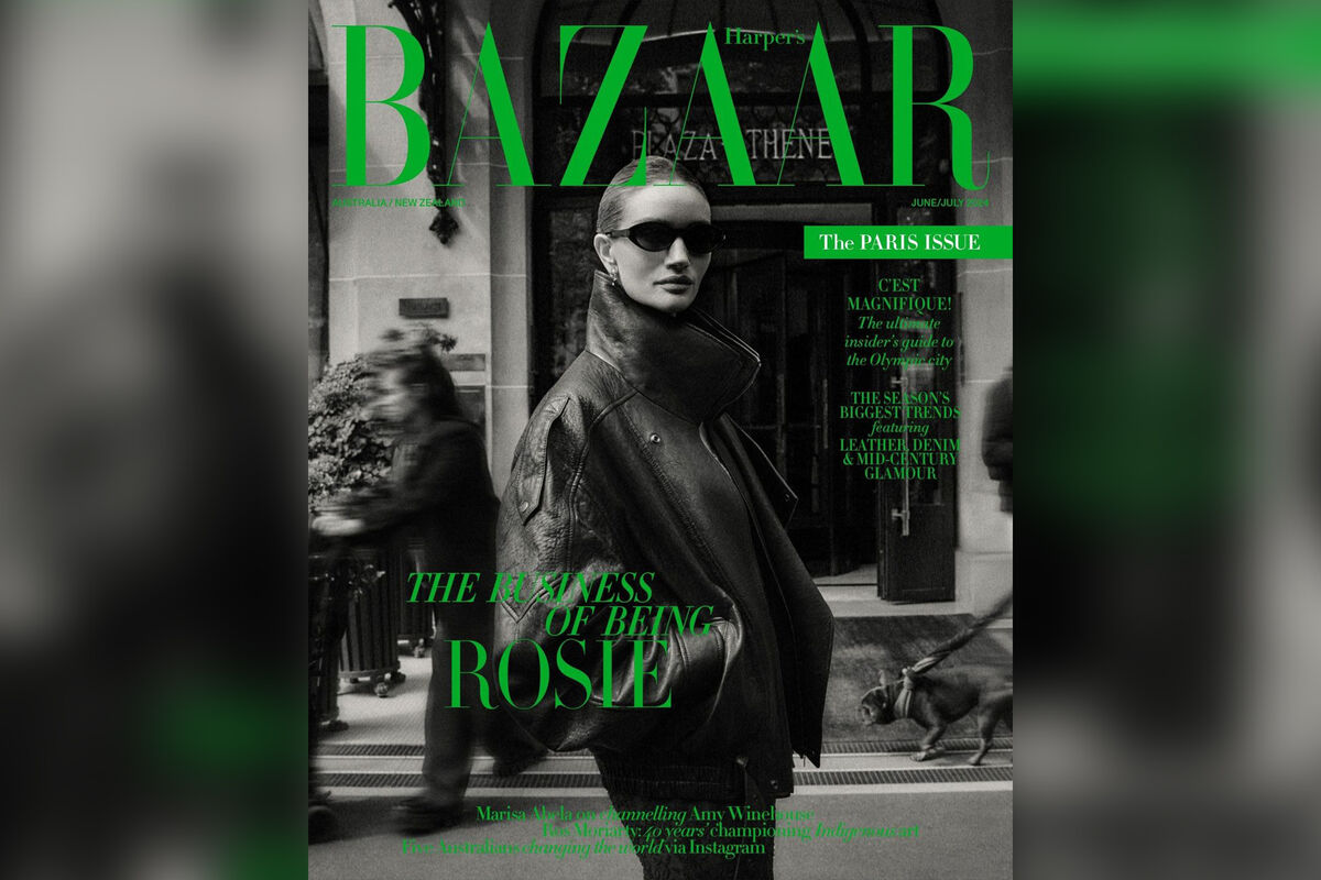 На обложке 37-летняя Роузи Хантингтон-Уайтли была запечатлена в кружевной юбке и объемной кожаной куртке Saint Laurent. Модель дополнила образ солнцезащитными очками и серьгами Tiffany & Co. Стилисты сделали ей гладкий низкий пучок. На другом кадре возлюбленная Джейсона Стетхэма позировала в черном боди, капроновых колготках, шубе и туфлях на каблуках. Она также надела золотые серьги и массивное колье. Бывший «ангел» Victoria's Secret стояла на лестнице на фоне Эйфелевой башни.