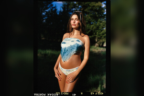 На одном из кадров 27-летняя Хейли Бибер предстала в белом платке с голубыми цветами, который повязала в качестве топа. Модель также надела трусы, ободок с бантом и несколько колец. Визажисты сделали бизнесвумен макияж в естественном стиле, а стилисты по волосам — легкую укладку.