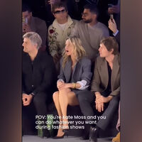 50-летняя Кейт Мосс посетила показ Dior Homme, который состоялся в Париже в рамках Недели мужской моды. Для светского мероприятия супермодель выбрала черный топ с декольте, серый жакет, шорты и туфли на каблуках. Звезде подиумов сделали макияж с черными стрелками и укладку.