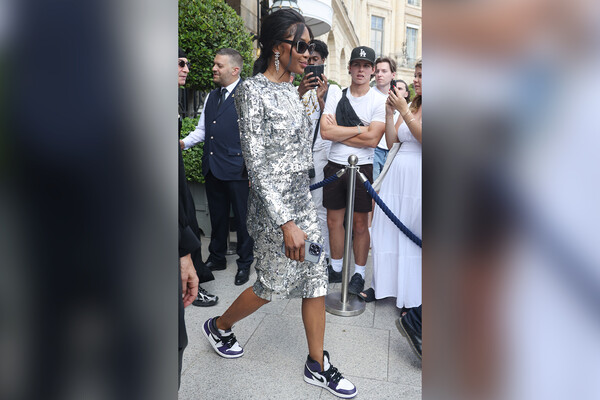Наоми Кэмпбелл вышла на публику в кроссовках. Модель предпочитает всегда ходить на каблуках и не признает спортивный стиль. Для выхода в Париже она предпочла серебряный костюм с жакетом и юбкой, которые дополнила фиолетовыми кроссовками Nike. Образ дополнили солнцезащитные очки и длинные серьги.
