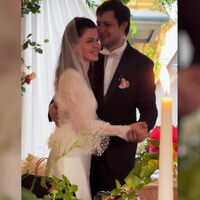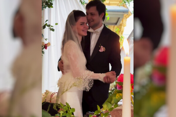 Тина Канделаки опубликовала видео свадебного танца новобрачных. Невеста была одета в белоснежное платье с глубоким декольте и фатой. Тина Канделаки не сообщила, где прошла свадьба, однако, судя по кадрам, церемония была за городом. Для торжества Тина Канделаки предпочла красный костюм из топа и юбки.