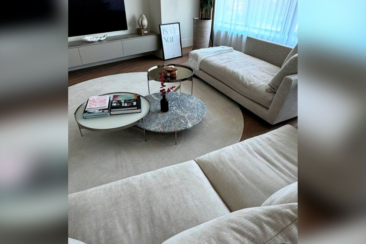 Вера Брежнева показала интерьер гостиной с панорамными окнами. Вся мебель выполнена в кремовых оттенках. В центре комнаты поставили мраморный и позолоченный столики. На фото также виден огромный телевизор и растение в керамическом горшке.