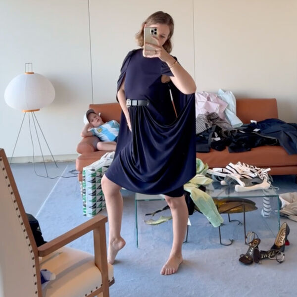 Ксения Собчак показала примерочную, в которой выбирала наряды из новой коллекции LOEWE. В этот момент ее сын Платон лежал на диване, спал, играл и делал уставшую гримасу на камеру.