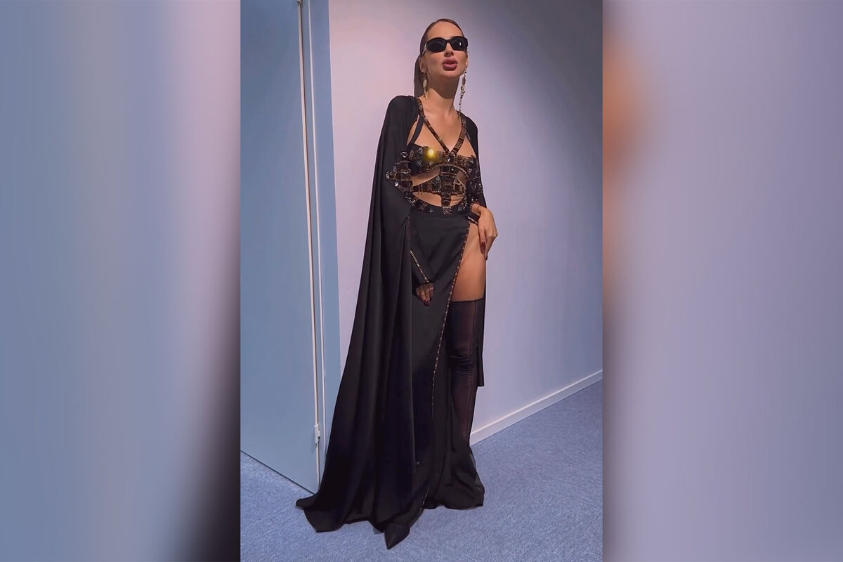 41-летняя Светлана Лобода танцевала в черном макси-платье с вырезом до бедра, верх которого был украшен кристаллами. Певица дополнила его накидкой, чулками, туфлями на каблуках, солнцезащитными очками и массивными золотыми серьгами. Визажисты сделали артистке макияж с розовой помадой, а стилисты по волосам — гладкий пучок.