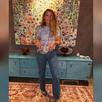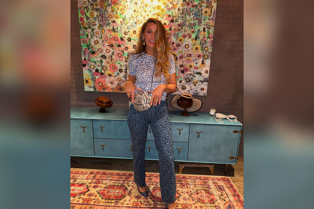 В прихожей знаменитостей находился голубой деревянный комод, на котором были расставлены свечи и шляпы. На кирпичной стене висела картина с изображением разных растений, а на полу лежал ковер в восточном стиле. В кадре стояла Блейк Лайвли, которая демонстрировала свой наряд с цветочным принтом.