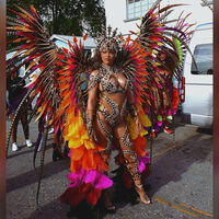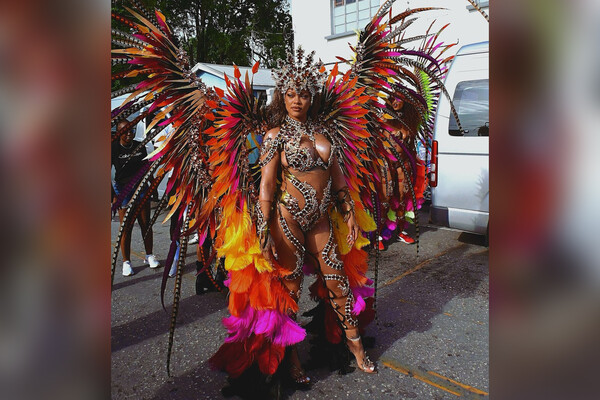 Рианна посетила фестиваль Crop Over, который посвящен празднику урожая на Барбадосе. Для мероприятия певица выбрала карнавальный полупрозрачный комбинезон, украшенный разноцветными камнями. Поп-исполнительница дополнила образ огромными крыльями, диадемой и золотыми босоножками на каблуках. Бизнесвумен распустила волосы и сделала макияж с черными стрелками и коричневой помадой.
