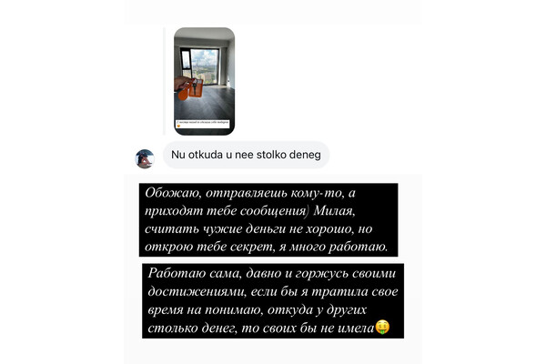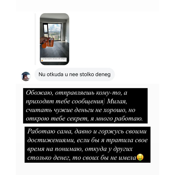 5 августа Ксения Бородина сообщила, что приобрела недвижимость в Москве с видом на парк Победы. Интернет-пользователи стали интересоваться источниками дохода телеведущей. Блогерша выложила скрин с сообщением одного из подписчиков и публично ответила. Звезда заявила, что она много работает и посоветовала не считать чужие деньги.