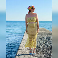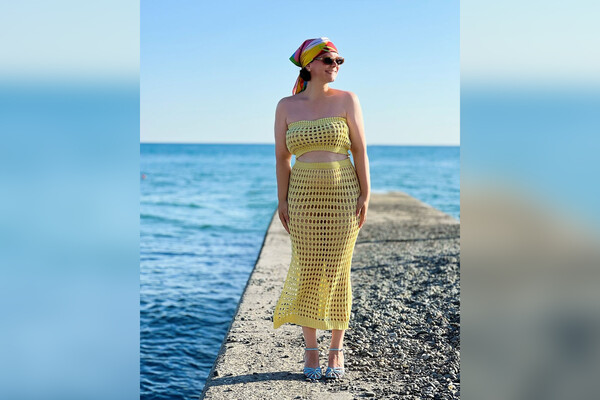 35-летняя Татьяна Брухунова позировала в желтом вязаном топе и юбке с завышенной талией. Жена Евгения Петросяна дополнила комплект косынкой на голову, солнцезащитными очками, бриллиантовыми серьгами и голубыми босоножками на каблуках.