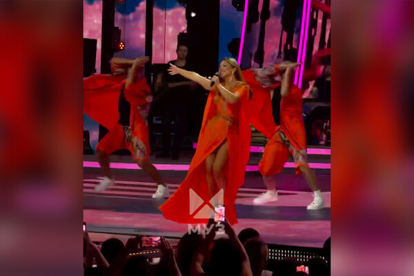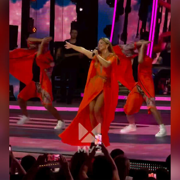45-летняя Ани Лорак вышла на сцену в оранжевом макси-платье с разрезами и декольте, которое было украшено стразами. Певица дополнила наряд серьгами и золотыми босоножками на платформе. Поп-исполнительница танцевала и случайно продемонстрировала трусы.