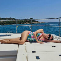 На одном из кадров 39-летняя Ляйсан Утяшева позировала в голубом слитном купальнике с цветочным принтом и розовыми вставками. Гимнастка дополнила пляжный образ солнцезащитными очками. Знаменитость с собранными волосами лежала на палубе яхты. Телеведущая рассказала, что снимки сделала ее дочь София.