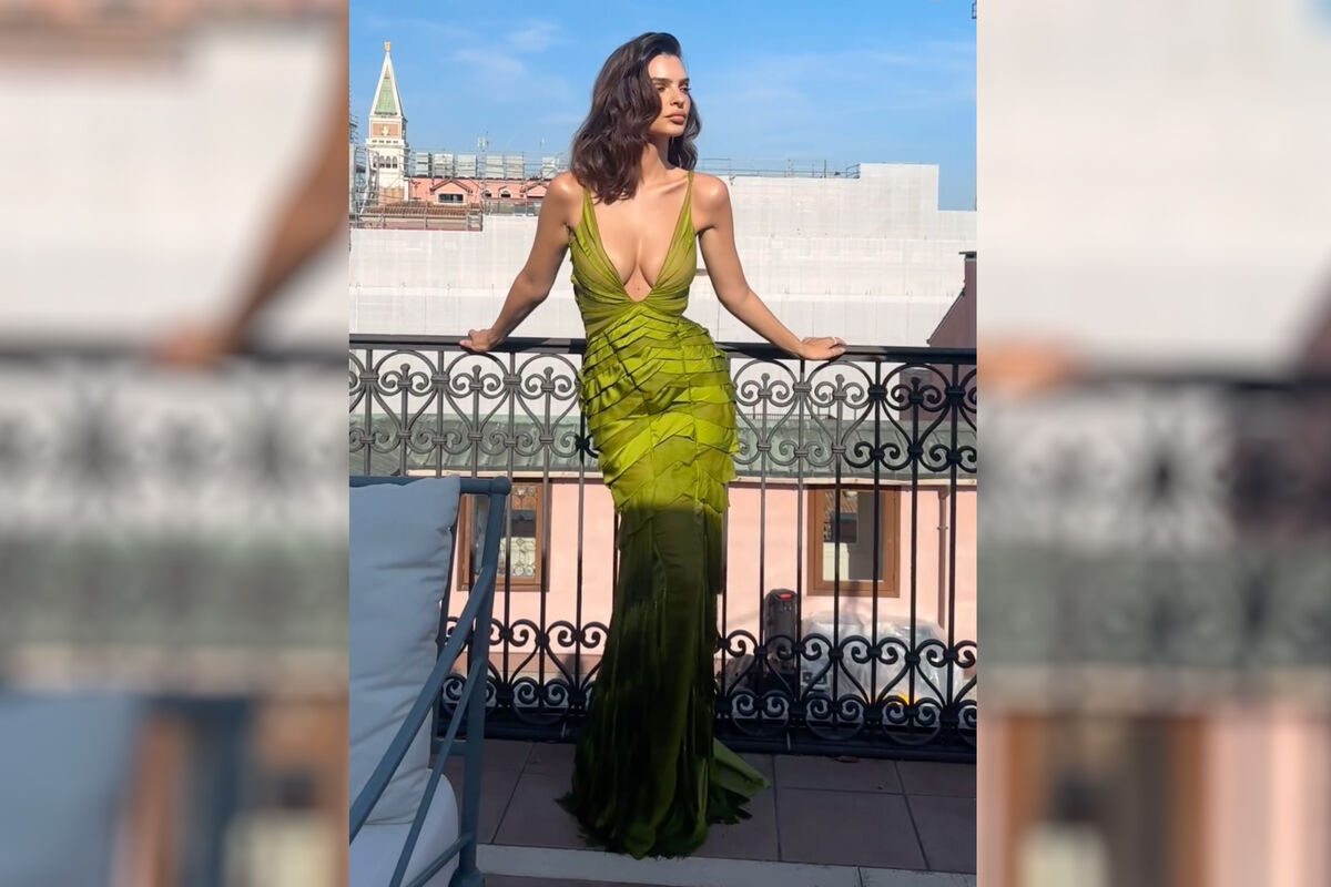 33-летняя Эмили Ратаковски была запечатлена в зеленом облегающем макси-платье Gucci 2004 года с глубоким декольте, которое было украшено бахромой. Над нарядом работал дизайнер Том Форд. Модель дополнила образ серьгами и бриллиантовыми кольцами. Визажисты сделали актрисе вечерний макияж с черными стрелками и нюдовыми губами, а стилисты — голливудскую укладку. Знаменитость позировала стоя на балконе. В этом образе Эмили Ратаковски отправилась на премьеру фильма «Поле боя», которая состоялась 31 августа на Венецианском кинофестивале.