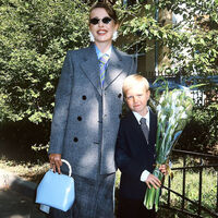 Ксения Собчак отправилась на школьную линейку сына, который сегодня пошел в первый класс. Для события журналистка выбрала голубую рубашку, серый жакет и юбку-миди в клетку. Телеведущая дополнила образ галстуком, розовыми туфлями на каблуках, белыми серьгами в форме цветов, сумкой и солнцезащитными очками. Платон был одет в белую рубашку, темно-синий брючный костюм, галстук и туфли.