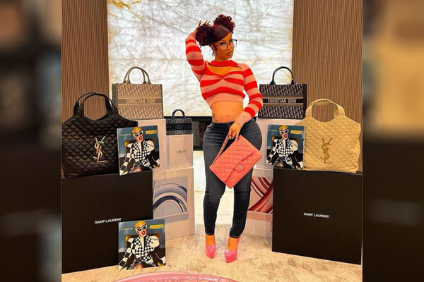 Карди Би позировала в облегающих джинсах и укороченном пестром топе. В руках она держала розовую сумку. Волосы она завязала в два высоких хвоста и сделала макияж со стрелками.
