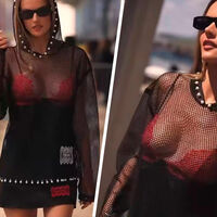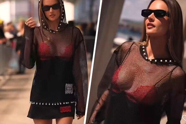 43-летняя «ангел» Victoria's Secret в кружевном красном бюстгальтере, топе-сетке и юбке прогулялась по спортивной площадке. Ей также сделали укладку и макияж с красной помадой. Образ завершили узкие солнцезащитные очки.