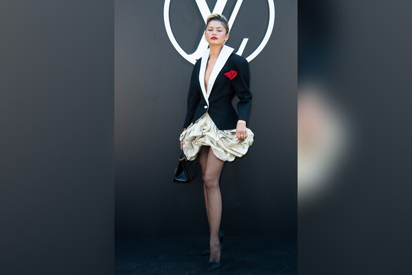 28-летняя Зендая стала гостьей показа бренда Louis Vuitton, который состоялся 1 октября в рамках Недели моды в Париже. Актриса выбрала для светского мероприятия черный жакет с белым воротником и красной брошью в форме веера и бежевую юбку с оборками. При этом звезда не стала надевать бюстгальтер. Зендая добавила к образу колготки в сетку, черные туфли на каблуках, серьги-кольца, золотые браслеты и сумку. Визажисты сделали ей макияж с красной помадой, а стилисты — высокую прическу.