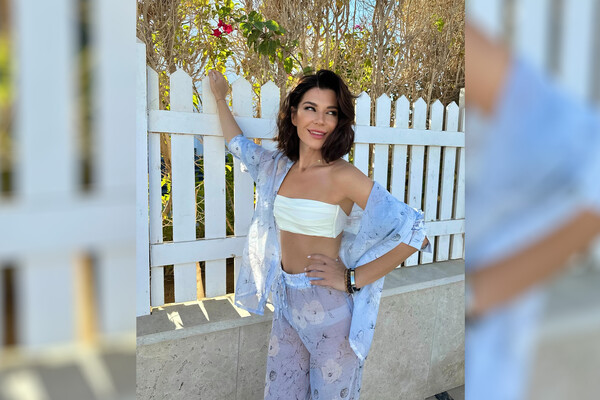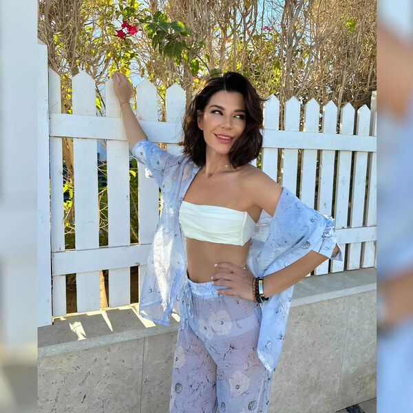 42-летняя Екатерина Волкова была запечатлена в молочном раздельном купальнике, поверх которого надела голубой прозрачный костюм с рубашкой и брюками. Актриса добавила к пляжному образу золотую цепочку и множество браслетов. Знаменитость сделала укладку и макияж с черными стрелками и розовой помадой.