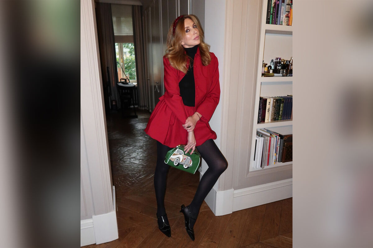 55-летняя Светлана Бондарчук позировала в красном костюме, который состоял из жакета и мини-юбки. Модель дополнила комплект черной водолазкой, колготками, туфлями на маленьком каблуке и блестящим бордовым ободком. Телеведущая завершила образ зеленой сумкой с изображением машины. Бизнесвумен уложила волосы и сделала макияж с черными стрелками и розовой помадой.