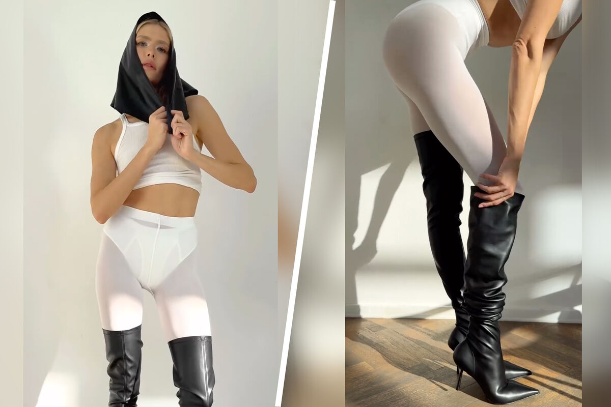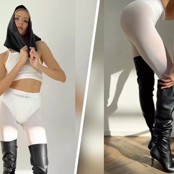 38-летняя Елена Перминова позировала в трусах, белой подвернутой майке и колготках в тон. При этом знаменитость не стала надевать бюстгальтер. Модель добавила к образу черные кожаные ботфорты на каблуках и косынку. Жена Лебедева распустила волосы и сделала макияж с серебристыми тенями и прозрачным блеском для губ.
