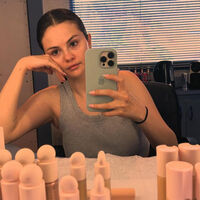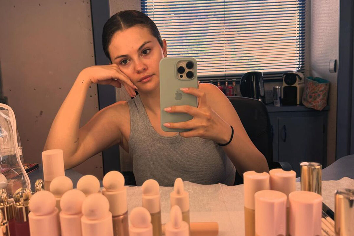 32-летняя Селена Гомес позировала без макияжа в гримерной. Актриса сидела перед зеркалом в серой майке с собранными в пучок волосами.