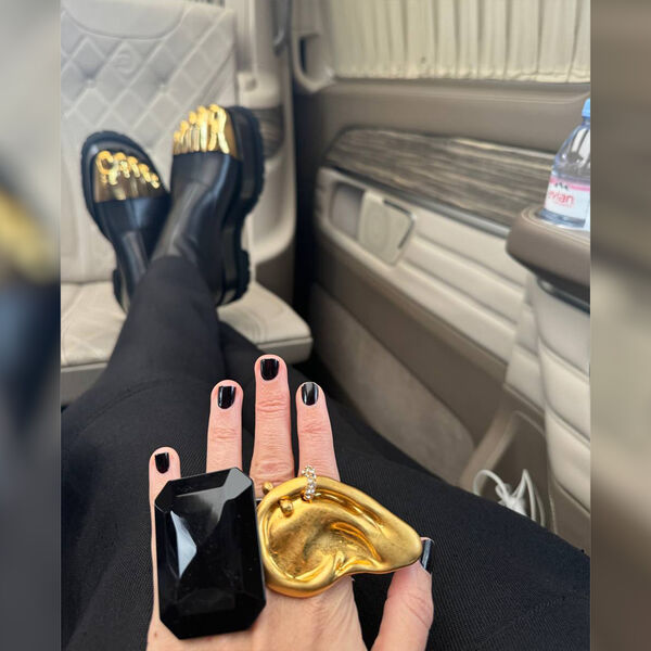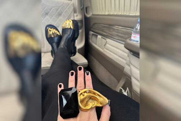 На снимке она показала аутфит с золотым кольцом в форме уха и кольцо с крупным черным камнем, а также ботинки с золотыми пальцами.