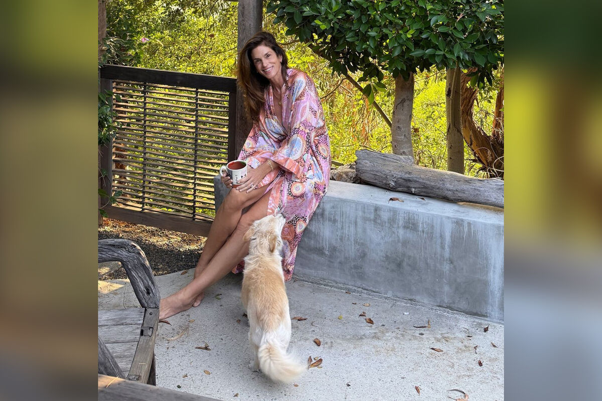 58-летняя Синди Кроуфорд позировала в розовом шелковом халате, золотой цепочке с кулоном и серьгах. Супермодель сидела у своего дома с распущенными волосами и без косметики. Знаменитость держала в руках кружку, а рядом с ней стояла собака.