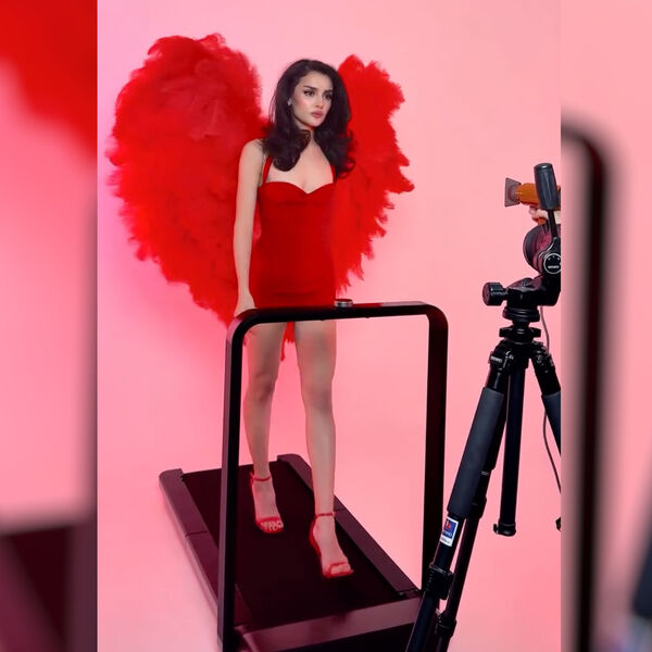 Дина Саева позировала в красном мини-комбинезоне с крыльями из перьев и босоножках на высоких каблуках. В вечернем образе она прошлась по беговой дорожке, демонстрируя походку моделей, как на подиуме.
