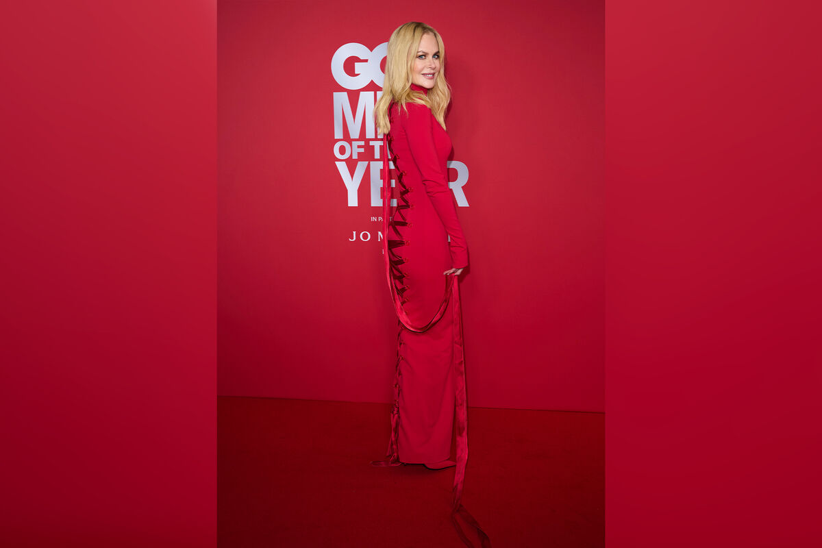 57-летняя Николь Кидман появилась на церемонии вручения премии GQ «Человек года», которая состоялась 19 ноября в Лондоне. Актриса вышла на ковровую дорожку в красном облегающем макси-платье, украшенном сзади шнуровкой. Звезда также надела остроносые туфли на каблуках в тон. Стилисты сделали Николь Кидман легкую укладку, а визажисты — вечерний макияж с черными стрелками и розовыми губами.