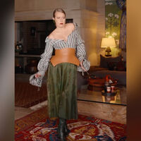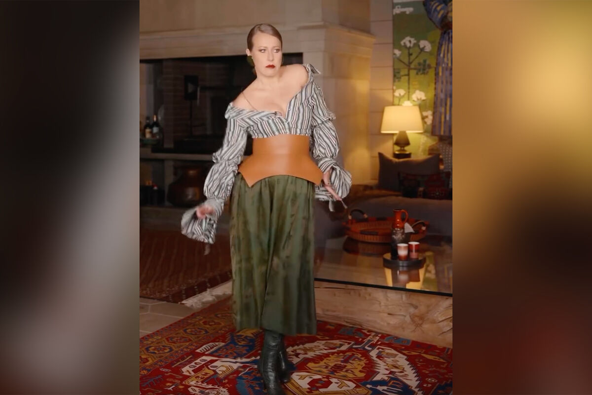 43-летняя Ксения Собчак предстала перед камерой в полосатой блузе с глубоким декольте и расклешенными рукавами, которую дополнила темно-зеленой миди-юбкой, черными сапогами на каблуках, коричневым кожаным поясом и массивными серьгами. Журналистка позировала с собранными в пучок волосами и макияжем с бордовой помадой. Она исполняла танцы, которые популярны в сети.
