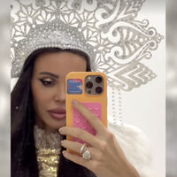 Оксана Самойлова примерила образ Снегурочки с золотой шубой с меховой отделкой и серебряном кокошнике. Волосы ей уложили локонами и сделали макияж с угольно-черными стрелками.