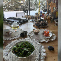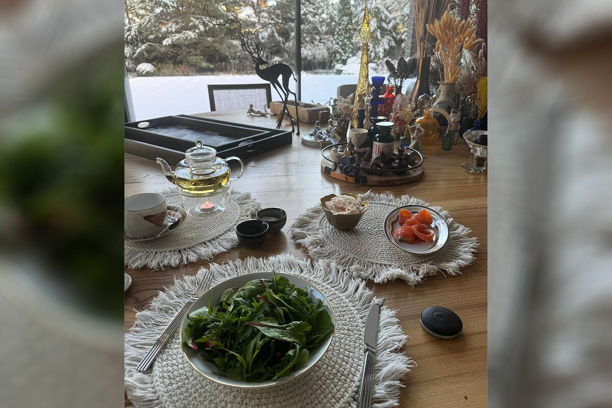 Ксения Собчак показала часть интерьера дома: столовую с панорамным видом на внутренний двор с сосновым лесом, а также деревянный стол с вазами, свечами, новогодним декором, подносами и сервизом на завтрак.