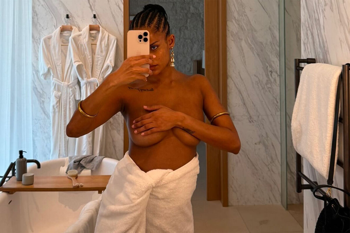 27-летняя Нара Баптиста стояла перед зеркалом, прикрыв голую грудь рукой. Модель обмоталась полотенцем и надела только золотые украшения: серьги с жемчугом и массивные браслеты. Знаменитость собрала волосы в высокий пучок и отказалась от косметики.