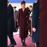 Королевская пара прибыла на официальную встречу с эмиром Катара шейхом Тамимом и его женой Джавахир. Для выхода на публику принцесса Уэльская предпочла бордовое пальто Alexander McQueen и шляпку в тон Sahar Millinery. Цвет наряда соответствовал флагу Катара. Образ завершили жемчужные украшения Елизаветы II.