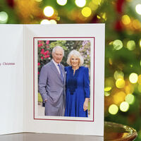 Король Карл III и королева Камилла выбрали кадр, на котором были запечатлены в садах Букингемского дворца в апреле. Снимок был сделан фотографом Милли Пилкингтон. Монарх стоял в белой рубашке с галстуком и светло-сером костюме, а его супруга — в синем шерстяном платье Fiona Clare.