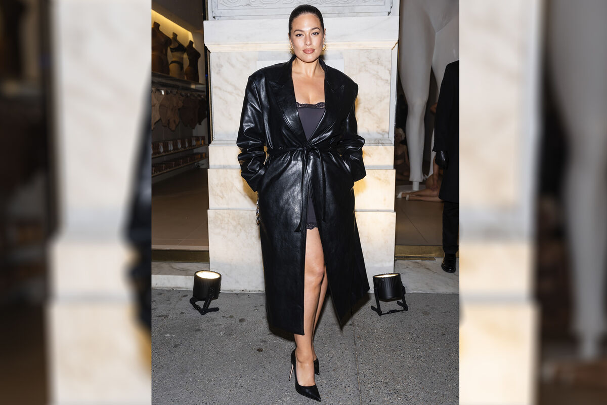 Эшли Грэм появилась на открытии бутика SKIMS в черном мини-платье с отделкой из кружева и кожаном тренче в тон. Образ дополнили туфли на высоких каблуках с острым мысом и массивные золотые серьги.