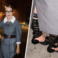 43-летняя Ксения Собчак предстала перед камерой в сером костюме с юбкой-миди с разрезом Shushu/Tong и черных туфлях с ремнями на каблуках Giuseppe di Morabito. Журналистка дополнила образ очками для зрения, кожаным ремнем Etro, браслетами, кольцами и сумкой Hermès.