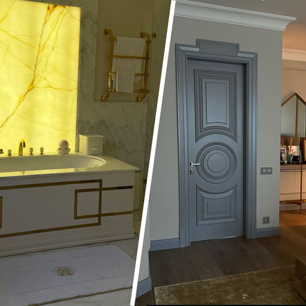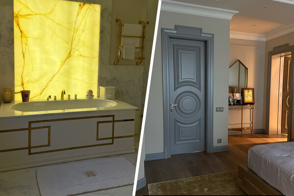 Дизайн ванной комнаты Ксении Бородиной выполнен из светлого мрамора. На стене висит панно с подсветкой. На ванне с золотистой фурнитурой стоят свеча в подсвечнике, ваза, статуэтка в форме ладоней и корзина. Спальня телеведущей выполнена в светлых тонах. Напротив кровати расположен золотистый стол и зеркало.