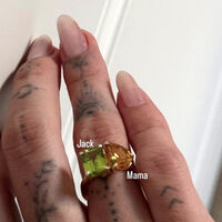 Модель Хейли Бибер опубликовала фото кольца, которое состояло из светло-зеленого хризолита и желтого топаза в форме капли. Кольцо было надето на безымянном пальце.