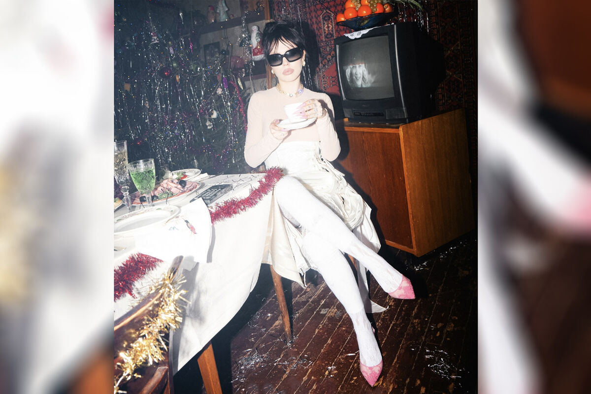 24-летняя певица позировала в кремовом лонгсливе, юбке и розовых балетках из кружева. Волосы она уложила в низкий пучок и сделала макияж в советском стиле. Съемка прошла в интерьере со старинным телевизором, елкой с советскими игрушками и дождиком и стульями, украшенными мишурой. Снимки она также состарила с помощью фильтров.
