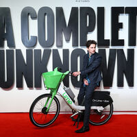 Тимоти Шаламе посетил британскую премьеру байопика о Бобе Дилане со своим участием «Боб Дилан: Никому не известный» и приехал на красную дорожку на зеленом велосипеде.