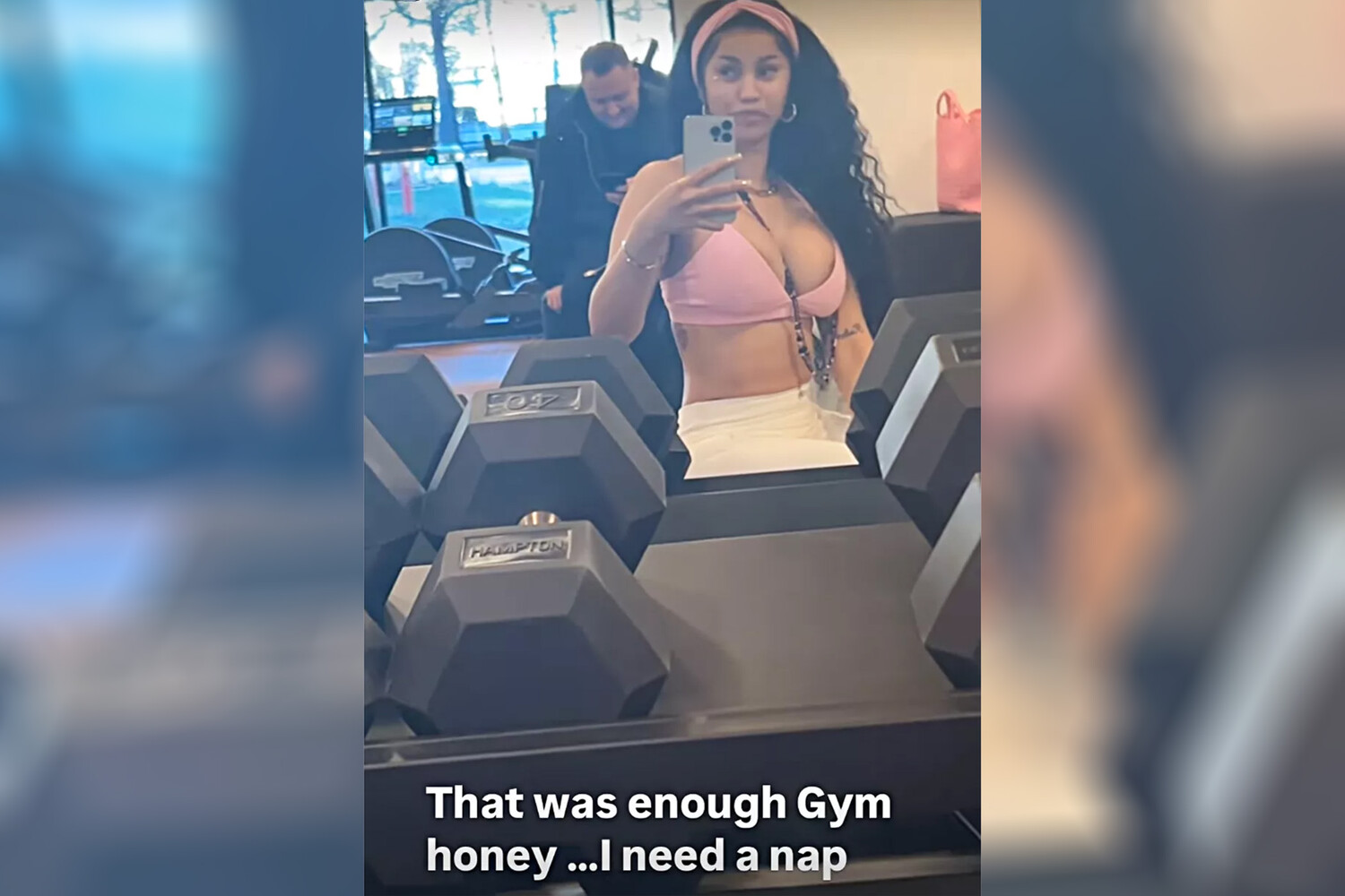 32-летняя Карди Би позировала в розовом топе с декольте во время тренировки. Рэперша также надела белый низ, повязку на голову, массивные серьги-кольца, браслет и бусы. Знаменитость была запечатлена с распущенными волосами и без косметики.