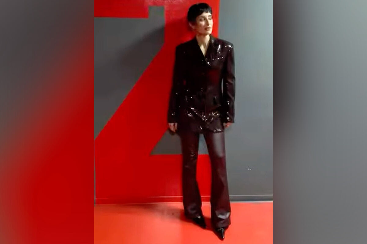 Тина Канделаки позировала в бордовых кожаных брюках, лакированном жакете и сапогах с острым мысом.