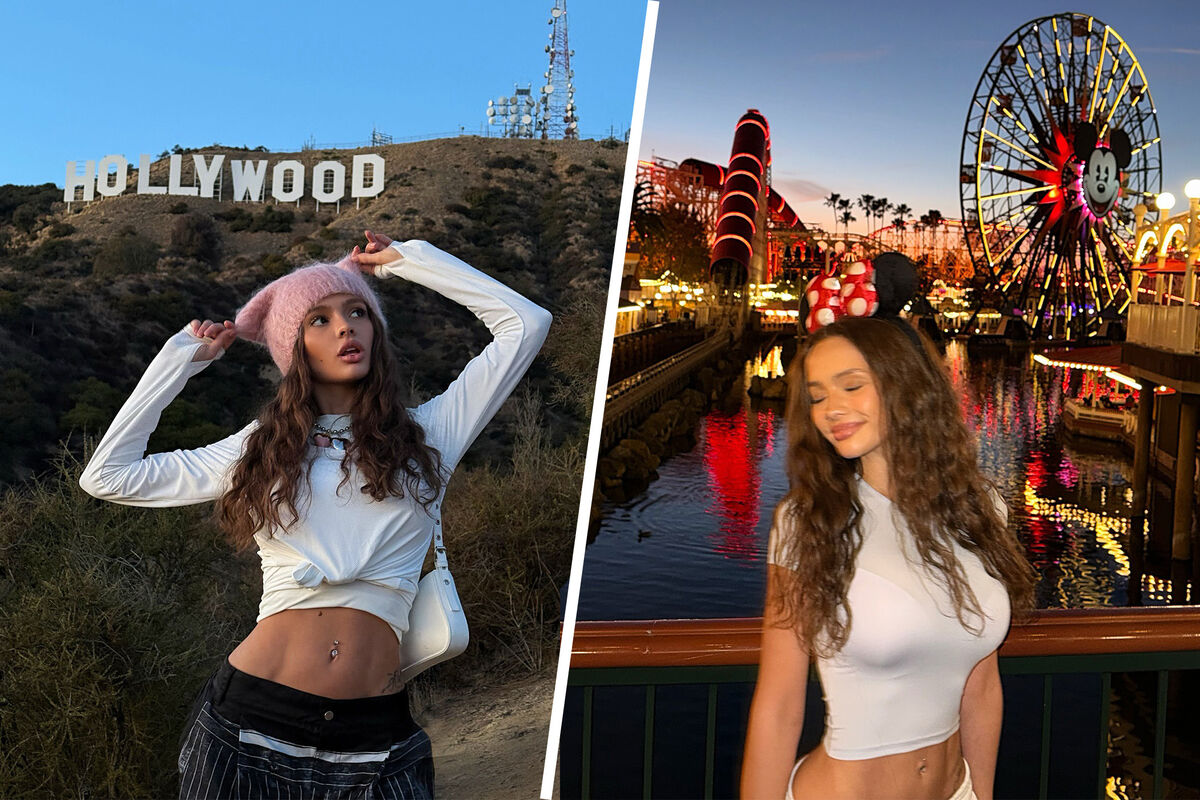 На одном из кадров 23-летняя Валя Карнавал позировала в Диснейленде в Калифорнии. Блогерша была запечатлена в белом облегающем топе и ободке с ушами Минни Маус на фоне аттракционов. На другом снимке певица предстала в светлом лонгсливе, темном низе и розовой шерстяной шапке. Знаменитость добавила к образу ожерелье с сердцами и сумку на плечо. Валя Карнавал снялась на фоне знака Голливуда.