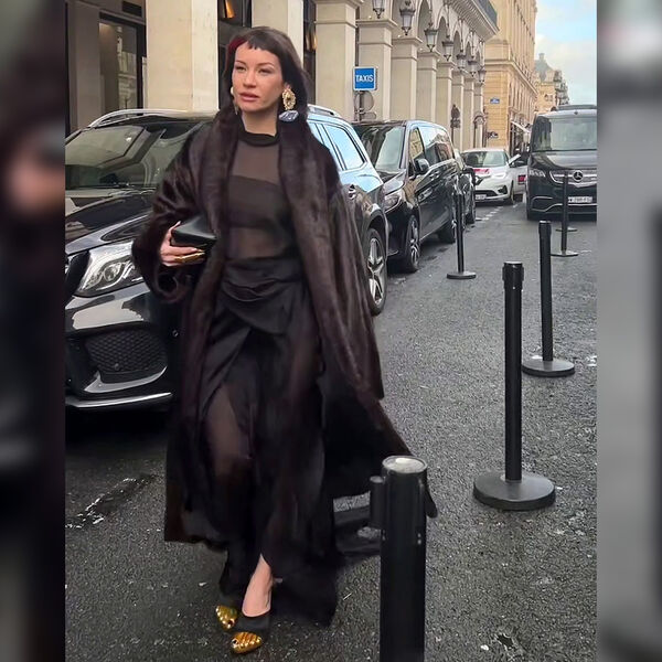 Ида Галич стала гостьей показала бренда Schiaparelli. Для шоу телеведущая выбрала черное «голое» макси-платье, поверх которого надела длинную коричневую шубу. Блогерша добавила к образу туфли на каблуках с золотым мысом, массивные серьги и клатч. Знаменитость уложила волосы и сделала макияж с блеском для губ.