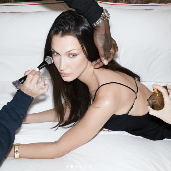 Белла Хадид позировала в черном платье с глубоким вырезом на спине, лежа на кровати. Волосы ей распустили и сделали вечерний макияж. Вокруг нее в кадре были стилисты по волосам и визажисты.