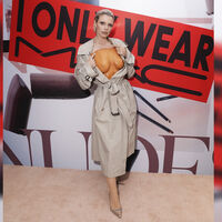 Джулия Фокс появилась на мероприятии в бежевом тренче и накладной грудью, повторив образ Бьянки Цензори на премии. Образ дополнили бежевые туфли Jimmy Choo на каблуках, украшенными узорами.