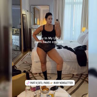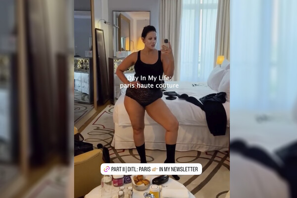 37-летняя Эшли Грэм снялась в черных трусах из кружева, топе с глубоким декольте и носках. Волосы она собрала в пучок и отказалась от макияжа, надев на лицо маску. Съемку она устроила в номере отеля в Париже во время Недели моды в Париже.