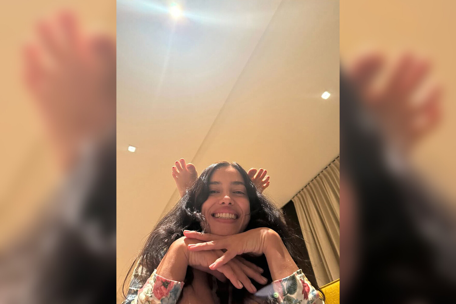 39-летняя Ирина Шейк сидела на диване с дочерью, которая закинула ей ноги за голову. Супермодель позировала в молочной пижаме с цветочным принтом. Звезда подиумов была запечатлена с распущенными волосами и без косметики.