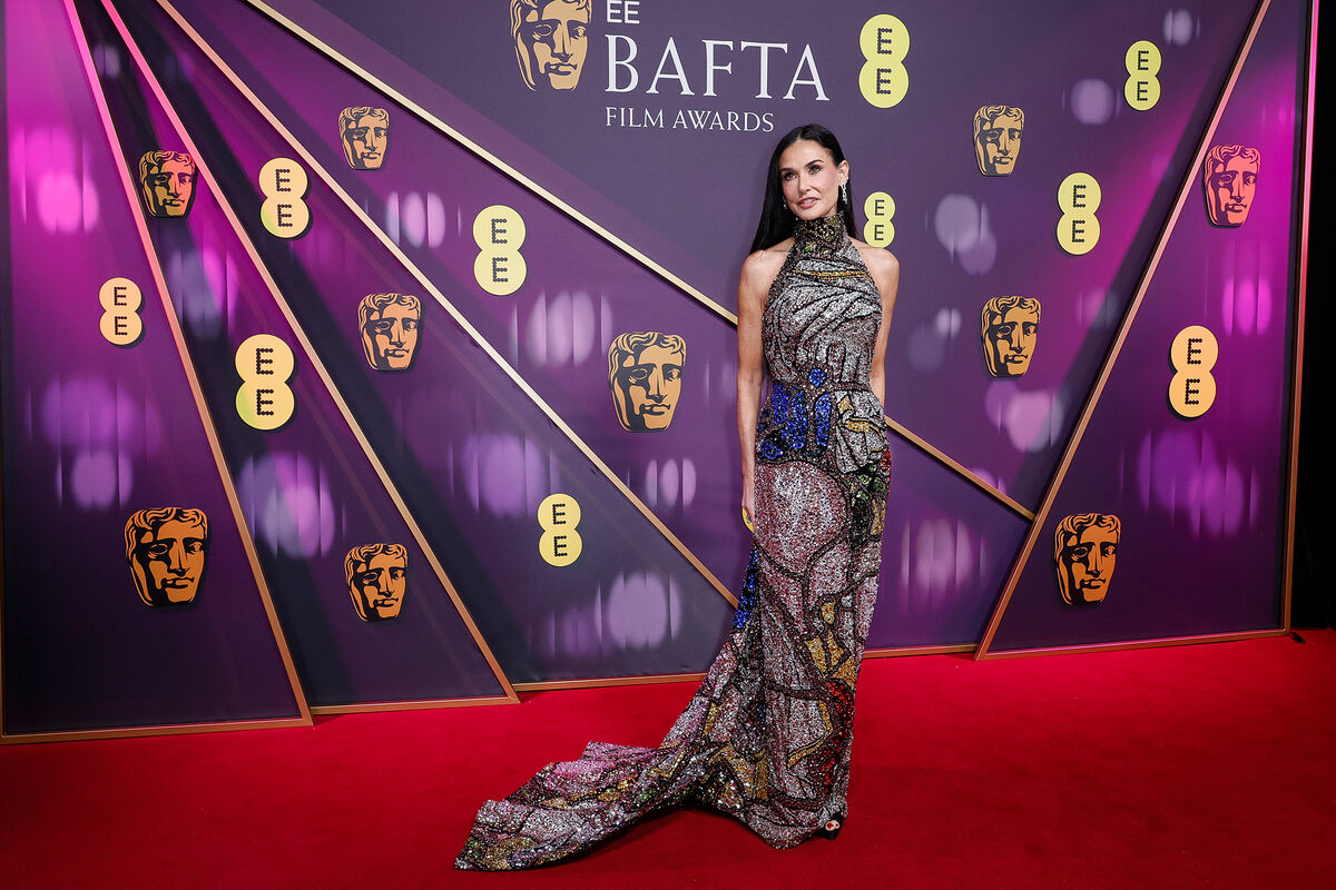 62-летняя Деми Мур посетила церемонию вручения Британской академии кино и телевизионных искусств (BAFTA), которая состоялась 16 февраля в Лондоне. Актриса была одета в разноцветное макси-платье Alexander McQueen с вырезом на спине и шлейфом, расшитое пайетками. Артистка дополнила образ серьгами разной длины, браслетом, кольцом, блестящим клатчем в тон платью и босоножками на каблуках Christian Louboutin. Знаменитости уложили волосы и сделали вечерний макияж.